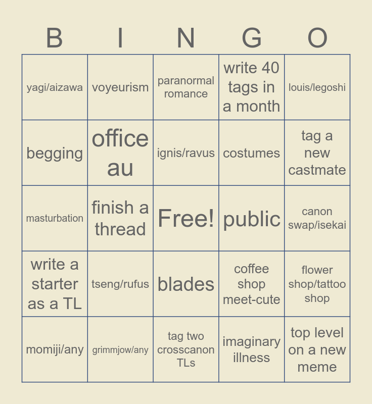 This bingo card has a free space and 24 words: tseng/rufus, grimmjow/any, ignis/ravus, momiji/any, louis/legoshi, yagi/aizawa, begging, voyeurism, public, blades, costumes, masturbation, coffee shop meet-cute, flower shop/tattoo shop, office au, imaginary illness, canon swap/isekai, paranormal romance, tag a new castmate, finish a thread, top level on a new meme, write a starter as a TL, write 40 tags in a month and tag two crosscanon TLs.