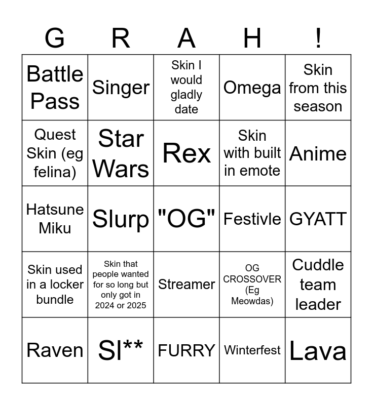 This bingo card has 30 words: Sl**, Hot, Slurp, Marvel, Battle Pass, Skin I would gladly date, Star Wars, Streamer, Festivle, FURRY, GYATT, "OG", Winterfest, Lava, Anime, renegade raider, OG CROSSOVER (Eg Meowdas), Skin used in a locker bundle, Skin that people wanted for so long but only got in 2024 or 2025, Skin from this season, Hatsune Miku, Greek God, Singer, Skin with built in emote, Quest Skin (eg felina), Omega, Cuddle team leader, Raven, Rex and DJ Yonder.
