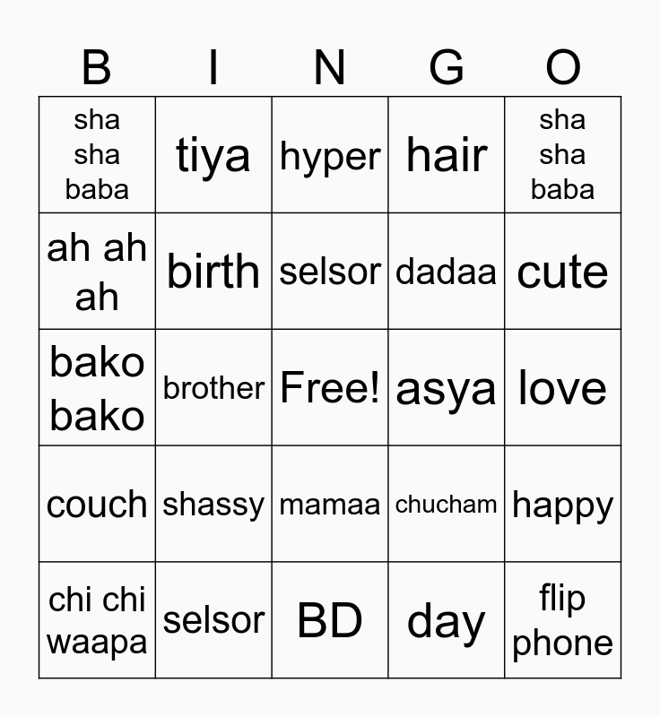 This bingo card has a free space and 24 words: shassy, selsor, selsor, chi chi waapa, sha sha baba, sha sha baba, ah ah ah, tiya, asya, mamaa, dadaa, bako bako, chucham, happy, birth, day, love, hyper, cute, brother, flip phone, couch, hair and BD.