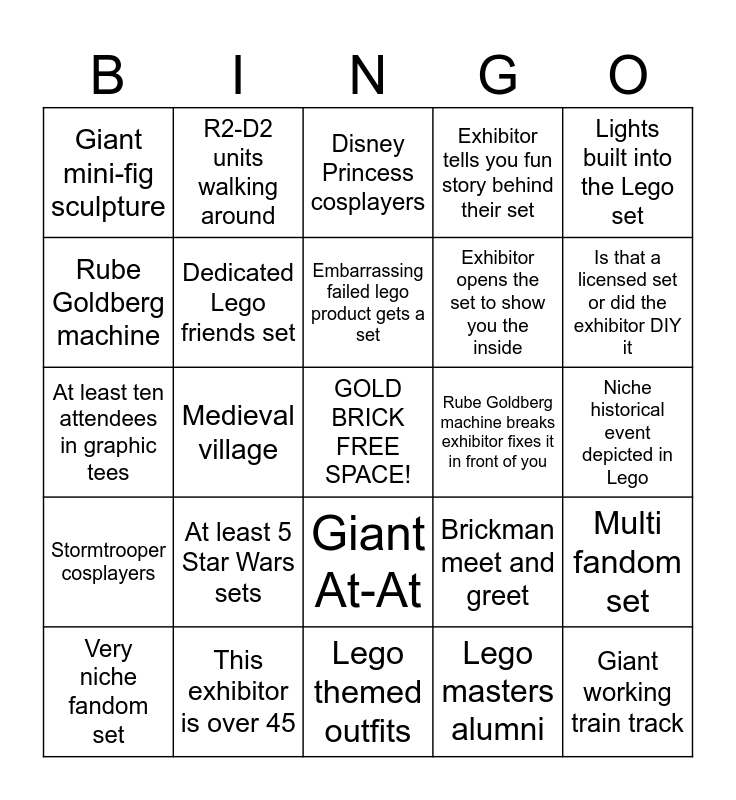 This bingo card has a free space and 24 words: At least 5 Star Wars sets, This exhibitor is over 45, Embarrassing failed lego product gets a set, Very niche fandom set, Lights built into the Lego set, Giant mini-fig sculpture, Rube Goldberg machine, R2-D2 units walking around, Rube Goldberg machine breaks exhibitor fixes it in front of you, Giant At-At, Exhibitor opens the set to show you the inside, At least ten attendees in graphic tees, Brickman meet and greet, Multi fandom set, Dedicated Lego friends set, Lego masters alumni, Niche historical event depicted in Lego, Disney Princess cosplayers, Is that a licensed set or did the exhibitor DIY it, Medieval village, Giant working train track, Stormtrooper cosplayers, Exhibitor tells you fun story behind their set and Lego themed outfits.
