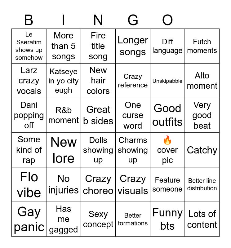 This bingo card has 36 words: Crazy visuals, Crazy choreo, Better formations, Larz crazy vocals, Some kind of rap, One curse word, Katseye in yo city eugh, Sexy concept, Diff language, Feature someone, Alto moment, Longer songs, Better line distribution, R&b moment, Crazy reference, Le Sserafim shows up somehow, Flo vibe, Good outfits, Dani popping off, Fire title song, Great b sides, New lore, Charms showing up, Dolls showing up, 🔥 cover pic, More than 5 songs, Unskipabble, Has me gagged, New hair colors, Futch moments, Lots of content, Gay panic, Catchy, Very good beat, No injuries and Funny bts.