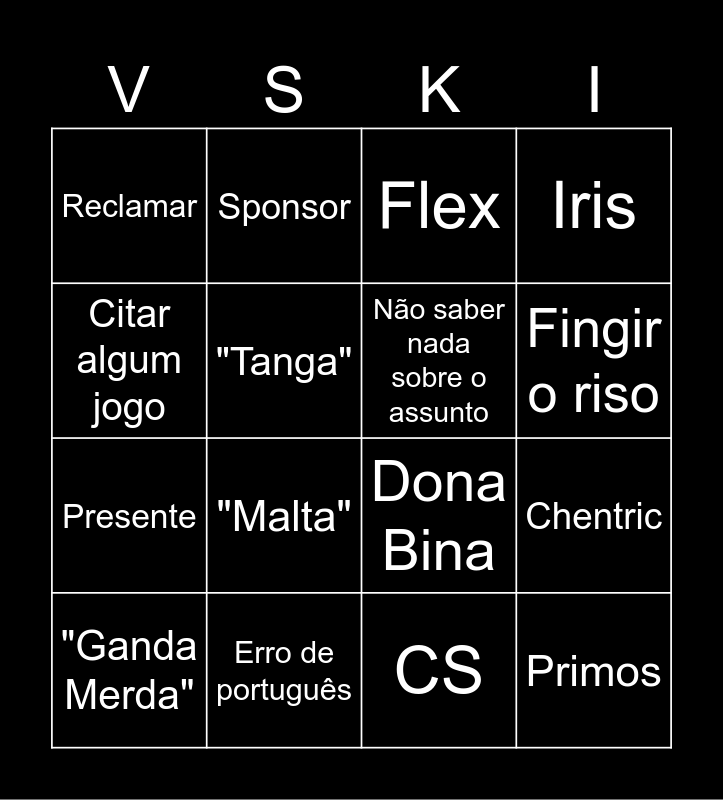 This bingo card has 22 words: Erro de português, Flame em alguém random, Sponsor, Free Sponsor, "Tanga", Não saber nada sobre o assunto, Reclamar, Flex, Dona Bina, Primos, Presente, Iris, Lag, Falar brasileiro, CS, Exagerar, Chentric, "Ganda Merda", "Malta", Citar algum jogo, Fingir o riso and Lamborghini.