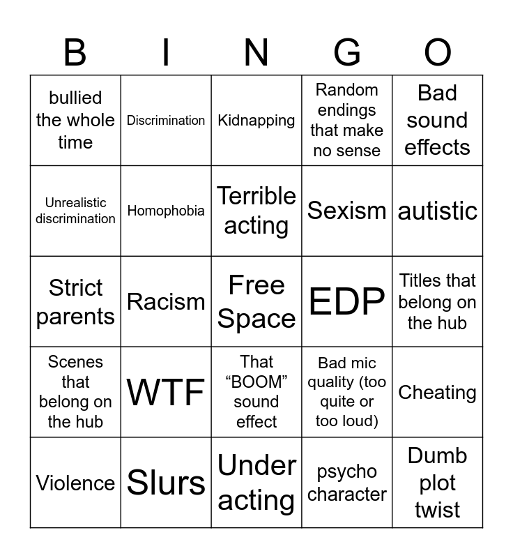 This bingo card has a free space and 24 words: WTF, Slurs, Terrible acting, Violence, Bad sound effects, bullied the whole time, Unrealistic discrimination, Discrimination, EDP, That “BOOM” sound effect, Sexism, Strict parents, Bad mic quality (too quite or too loud), Cheating, Homophobia, psycho character, Titles that belong on the hub, Kidnapping, autistic, Racism, Dumb plot twist, Scenes that belong on the hub, Random endings that make no sense and Under acting.