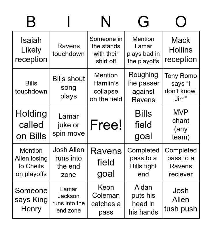 This bingo card has a free space and 24 words: Josh Allen runs into the end zone, Lamar Jackson runs into the end zone, Mention Hamlin’s collapse on the field, Someone says King Henry, Mack Hollins reception, Isaiah Likely reception, Bills touchdown, Ravens touchdown, Bills field goal, Ravens field goal, Roughing the passer against Ravens, Holding called on Bills, Completed pass to a Bills tight end, Completed pass to a Ravens reciever, Bills shout song plays, Aidan puts his head in his hands, MVP chant (any team), Someone in the stands with their shirt off, Tony Romo says “I don’t know, Jim”, Lamar juke or spin move, Josh Allen tush push, Mention Allen losing to Cheifs on playoffs, Mention Lamar plays bad in the playoffs and Keon Coleman catches a pass.