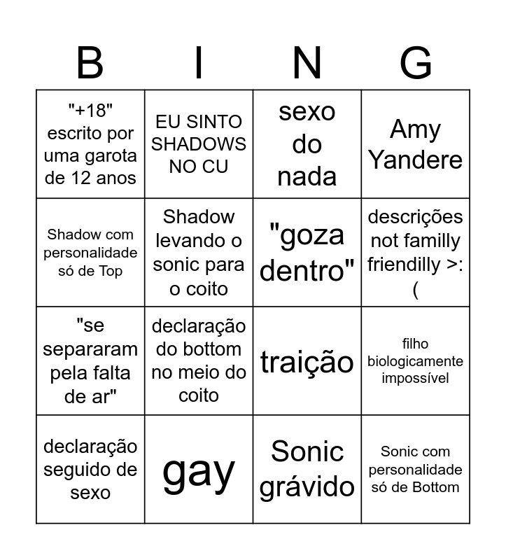 This bingo card has 16 words: gay, filho biologicamente impossível, sexo do nada, "+18" escrito por uma garota de 12 anos, "se separaram pela falta de ar", EU SINTO SHADOWS NO CU, traição, Sonic grávido, Shadow com personalidade só de Top, Shadow levando o sonic para o coito, declaração seguido de sexo, Amy Yandere, declaração do bottom no meio do coito, descrições not familly friendilly >:(, "goza dentro" and Sonic com personalidade só de Bottom.