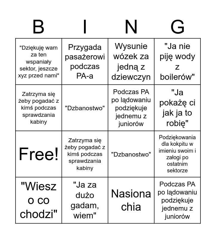 This bingo card has 20 words: "Wiesz o co chodzi", "No to co tam u ciebie, opowiadaj"/"Co jeszcze mi powiesz?", Wysunie wózek za jedną z dziewczyn, Podziękowania dla kokpitu w imieniu swoim i załogi po ostatnim sektorze, "Ja za dużo gadam, wiem", Zatrzyma się żeby pogadać z kimś podczas sprawdzania kabiny, Nasiona chia, "Ja nie piję wody z boilerów", Free!, Przygada pasażerowi podczas PA-a, "Dzbanostwo", "Ja pokażę ci jak ja to robię", "Dziękuję wam za ten wspaniały sektor, jeszcze xyz przed nami", "Justynka zrobiła xyz", Podczas PA po lądowaniu podziękuje jednemu z juniorów, Opis jakiegokolwiek przepisu, Zatrzyma się żeby pogadać z kimś podczas sprawdzania kabiny, "Dzbanostwo", "Ja za dużo gadam, wiem" and Podczas PA po lądowaniu podziękuje jednemu z juniorów.