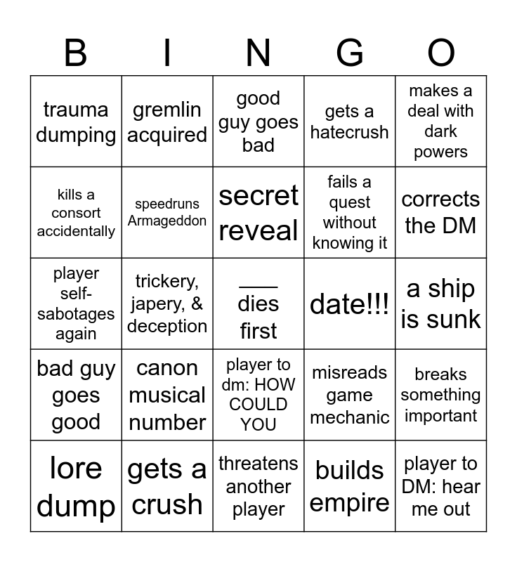 This bingo card has a free space and 24 words: canon musical number, gets a crush, secret reveal, lore dump, makes a deal with dark powers, trauma dumping, kills a consort accidentally, gremlin acquired, date!!!, player to dm: HOW COULD YOU, fails a quest without knowing it, player self-sabotages again, misreads game mechanic, breaks something important, speedruns Armageddon, builds empire, a ship is sunk, good guy goes bad, corrects the DM, trickery, japery, & deception, player to DM: hear me out, bad guy goes good, gets a hatecrush and threatens another player.