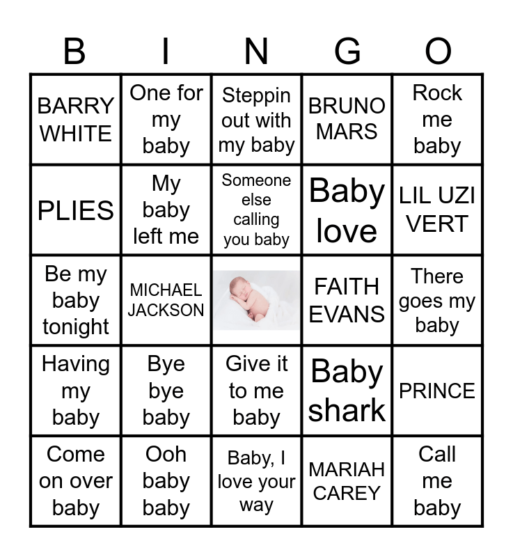 This bingo card has a free space and 94 words: Baby, baby, I got you babe, Baby, I love your way, Baby one more time, Baby, baby, baby, Hey baby, Be my baby, Come on over baby, Baby, Baby please don’t go, Be my baby, Here comes my baby, Baby, your a rich man, Baby love, Too busy thinking about my baby, Rock me baby, Steppin out with my baby, Baby got back, Baby, I love you, Cry baby, Always be my baby, Santa baby, Baby I, Baby, I need your loving, Bye bye baby, My baby left me, Rock-a-bye baby, Somebody’s baby, Baby be mine, Baby, I’m yours, Ooh baby baby, Give it to me baby, Can’t get enough of you baby, Baby, I love your way, One for my baby, Hey baby, LA baby, Baby it’s you, Someone else calling you baby, Baby shark, Be my baby tonight, Having my baby, There goes my baby, Don’t worry baby, Call me baby, Baby, I love you, Baby’s got her blue jeans on, Baby girl, Baby hold on, Baby blue, FOUR TOPS, MARIAH CAREY, WHITNEY HOUSTON, SMOKEY ROBINSON, SIR MIX-A-LOT, ASHANTI, USHER, BEYONCE, BRANDY, RAY CHARLES, MICHAEL JACKSON, BRITNEY SPEARS, LL COOL J, THE SUPREMES, TLC, TOMMY RICHMOND, 50 CENT, GERALD LEVERT, PLIES, CHARLIE WILSON, DONNA SUMMER, RICK JAMES, LIL NAS X, VANILLA ICE, BRUNO MARS, TUPAC, MEGAN THEE STALLION, LIL UZI VERT, PRINCE, JUSTIN BIEBER, NAS, LIL ROMEO, GHOSTFACE KILLAH, FAITH EVANS, BARRY WHITE, CHRISTINA AGUILERA, ARI LENNOX, ARIANA GRANDE, PITBULL, MACY GRAY, JANET JACKSON, ZENDAYA, SAM SMITH and DEMI LOVATO.