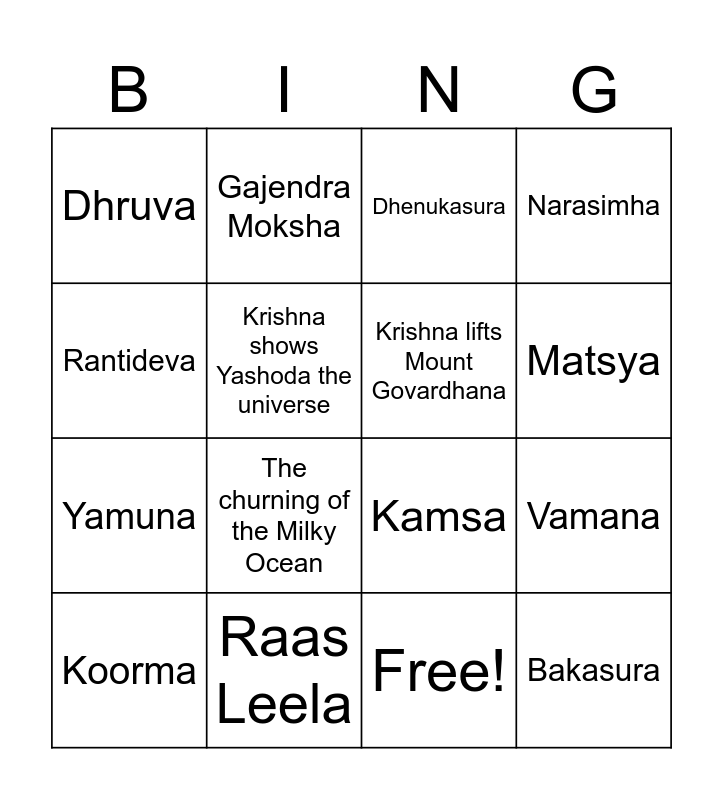 This bingo card has 17 words: Free!, Koorma, Dhenukasura, Dhruva, The churning of the Milky Ocean, Narasimha, Vamana, Krishna lifts Mount Govardhana, Matsya, Krishna shows Yashoda the universe, Raas Leela, Kamsa, Rantideva, Gajendra Moksha, Yamuna, Varaha and Bakasura.