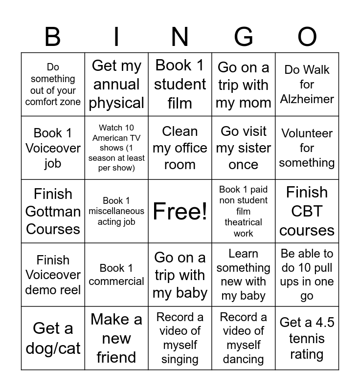 This bingo card has a free space and 24 words: Book 1 commercial, Make a new friend, Clean my office room, Get a dog/cat, Do Walk for Alzheimer, Do something out of your comfort zone, Book 1 Voiceover job, Get my annual physical, Book 1 paid non student film theatrical work, Go on a trip with my baby, Go visit my sister once, Finish Gottman Courses, Learn something new with my baby, Be able to do 10 pull ups in one go, Watch 10 American TV shows (1 season at least per show), Record a video of myself dancing, Finish CBT courses, Book 1 student film, Volunteer for something, Book 1 miscellaneous acting job, Get a 4.5 tennis rating, Finish Voiceover demo reel, Go on a trip with my mom and Record a video of myself singing.
