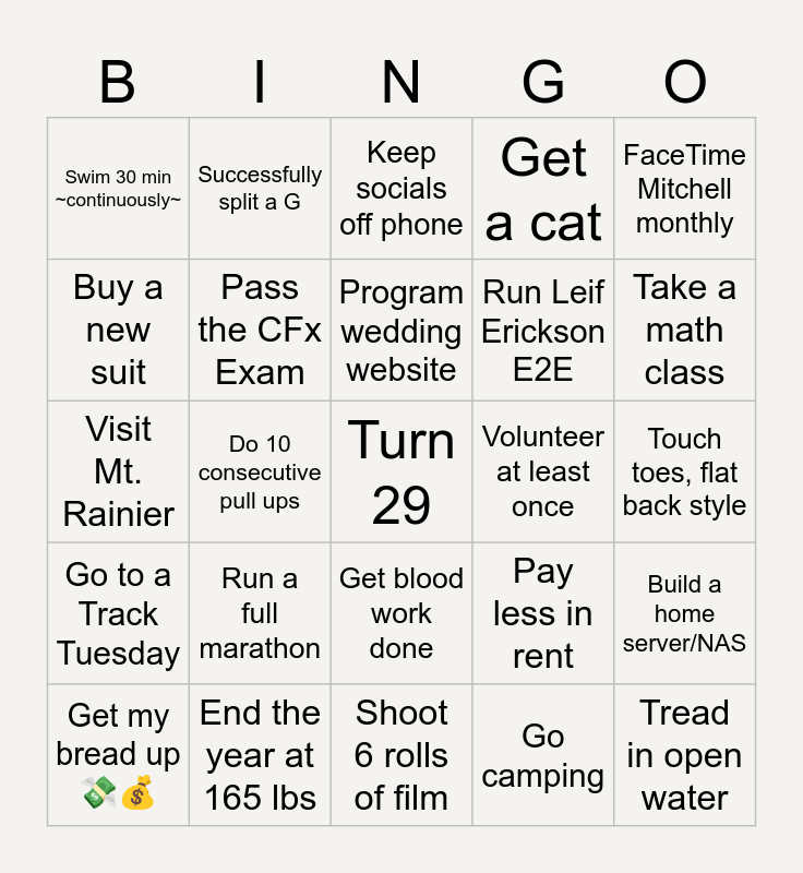 This bingo card has a free space and 24 words: Run a full marathon, End the year at 165 lbs, Program wedding website, Get my bread up πΈπ°, FaceTime Mitchell monthly, Swim 30 min ~continuously~, Buy a new suit, Successfully split a G, Volunteer at least once, Get blood work done, Run Leif Erickson E2E, Visit Mt. Rainier, Pay less in rent, Build a home server/NAS, Pass the CFx Exam, Go camping, Touch toes, flat back style, Keep socials off phone, Take a math class, Do 10 consecutive pull ups, Tread in open water, Go to a Track Tuesday, Get a cat and Shoot 6 rolls of film.