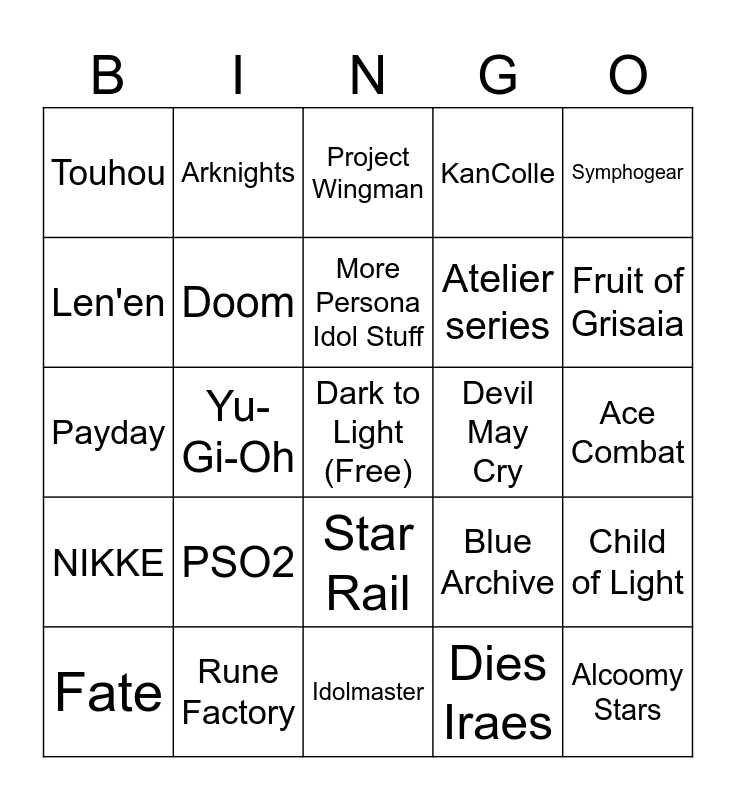 This bingo card has a free space and 24 words: PSO2, Rune Factory, More Persona Idol Stuff, Fate, Symphogear, Touhou, Len'en, Arknights, Devil May Cry, Star Rail, Atelier series, Payday, Blue Archive, Child of Light, Doom, Dies Iraes, Ace Combat, Project Wingman, Fruit of Grisaia, Yu-Gi-Oh, Alcoomy Stars, NIKKE, KanColle and Idolmaster.