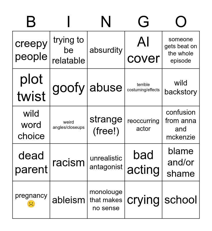 This bingo card has a free space and 24 words: racism, ableism, abuse, pregnancy ☹️, someone gets beat on the whole episode, creepy people, plot twist, trying to be relatable, reoccurring actor, unrealistic antagonist, terrible costuming/effects, wild word choice, bad acting, blame and/or shame, goofy, crying, confusion from anna and mckenzie, absurdity, wild backstory, weird angles/closeups, school, dead parent, AI cover and monolouge that makes no sense.