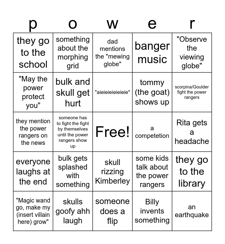 This bingo card has a free space and 24 words: bulk gets splashed with something, skulls goofy ahh laugh, "aieieieieieieie", "Magic wand go, make my (insert villain here) grow", "Observe the viewing globe", they go to the school, "May the power protect you", something about the morphing grid, a competetion, skull rizzing Kimberley, tommy (the goat) shows up, they mention the power rangers on the news, some kids talk about the power rangers, they go to the library, bulk and skull get hurt, Billy invents something, Rita gets a headache, dad mentions the "mewing globe", scorpina/Goulder fight the power rangers, someone has to fight the fight by themselves until the power rangers show up, an earthquake, everyone laughs at the end, banger music and someone does a flip.