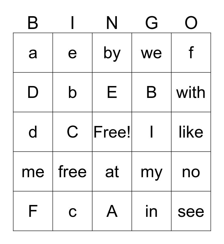 This bingo card has a free space and 24 words: free, c, E, F, f, a, D, e, I, at, B, d, my, no, b, in, like, by, with, C, see, me, we and A.