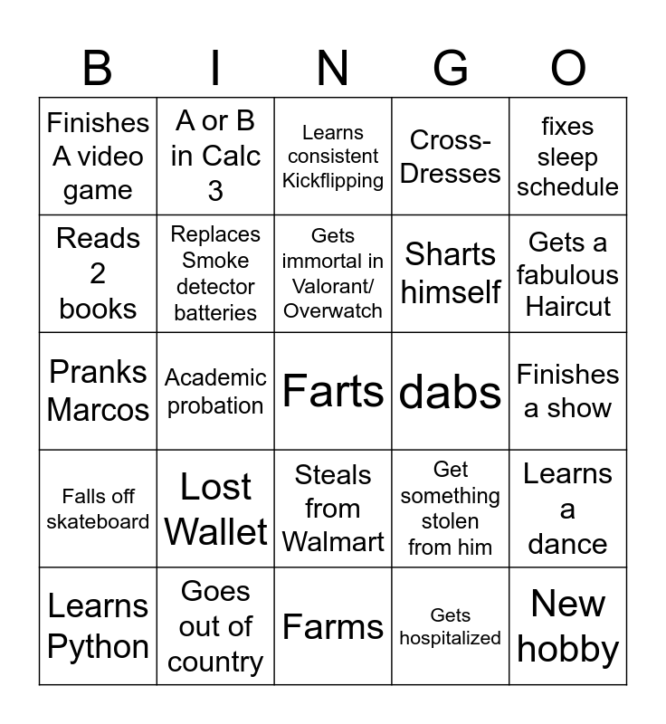 This bingo card has a free space and 24 words: Lost Wallet, Goes out of country, Gets immortal in Valorant/ Overwatch, Learns Python, fixes sleep schedule, Finishes A video game, Reads 2 books, A or B in Calc 3, dabs, Steals from Walmart, Sharts himself, Pranks Marcos, Get something stolen from him, Learns a dance, Replaces Smoke detector batteries, Gets hospitalized, Finishes a show, Learns consistent Kickflipping, Gets a fabulous Haircut, Academic probation, New hobby, Falls off skateboard, Cross-Dresses and Farms.