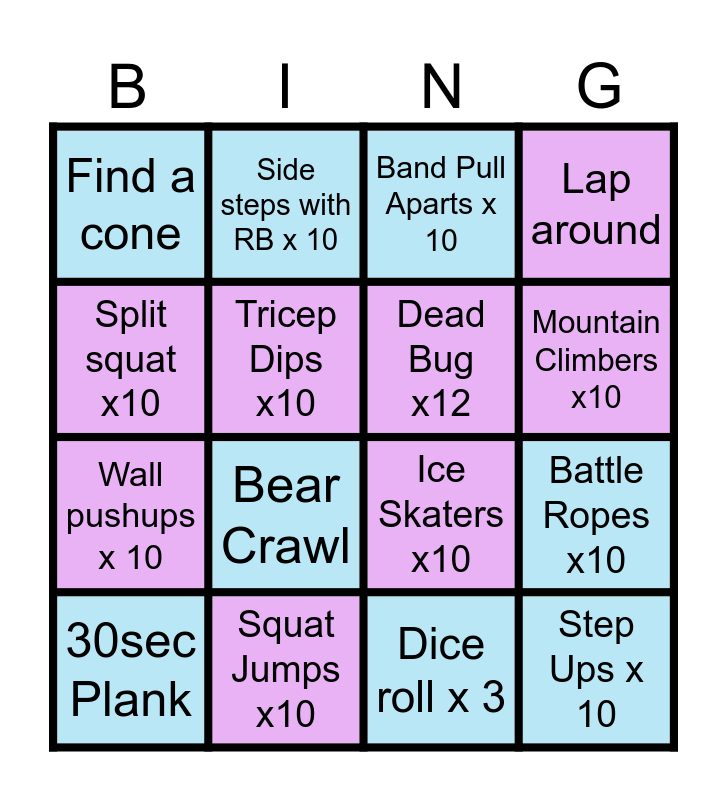 This bingo card has 16 words: 30sec Plank, Squat Jumps x10, Band Pull Aparts x 10, Lap around, Split squat x10, Side steps with RB x 10, Ice Skaters x10, Battle Ropes x10, Find a cone, Tricep Dips x10, Dice roll x 3, Mountain Climbers x10, Wall pushups x 10, Bear Crawl, Dead Bug x12 and Step Ups x 10.