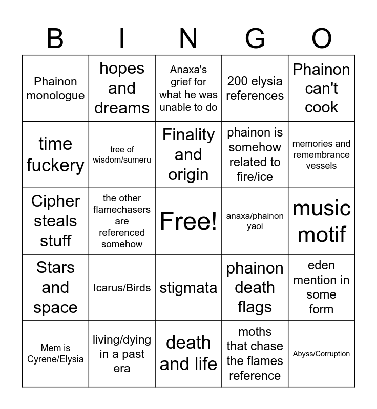This bingo card has a free space and 24 words: Icarus/Birds, living/dying in a past era, Finality and origin, Mem is Cyrene/Elysia, Phainon can't cook, Phainon monologue, time fuckery, hopes and dreams, anaxa/phainon yaoi, stigmata, phainon is somehow related to fire/ice, Cipher steals stuff, phainon death flags, eden mention in some form, tree of wisdom/sumeru, moths that chase the flames reference, music motif, Anaxa's grief for what he was unable to do, memories and remembrance vessels, the other flamechasers are referenced somehow, Abyss/Corruption, Stars and space, 200 elysia references and death and life.