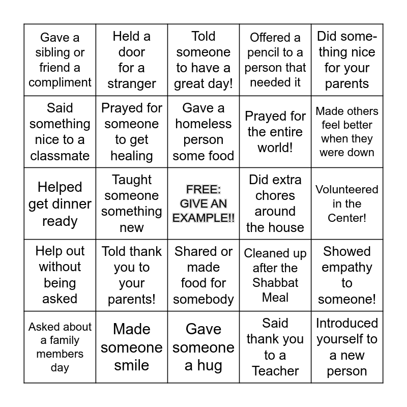 This bingo card has a free space and 24 words: Told thank you to your parents!, Made someone smile, Gave a homeless person some food, Asked about a family members day, Did some- thing nice for your parents, Gave a sibling or friend a compliment, Said something nice to a classmate, Held a door for a stranger, Did extra chores around the house, Shared or made food for somebody, Prayed for the entire world!, Helped get dinner ready, Cleaned up after the Shabbat Meal, Showed empathy to someone!, Prayed for someone to get healing, Said thank you to a Teacher, Volunteered in the Center!, Told someone to have a great day!, Made others feel better when they were down, Taught someone something new, Introduced yourself to a new person, Help out without being asked, Offered a pencil to a person that needed it and Gave someone a hug.