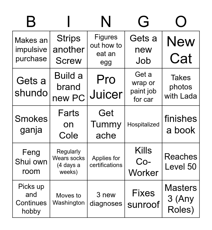 This bingo card has a free space and 24 words: Regularly Wears socks (4 days a weeks), Moves to Washington, Pro Juicer, Picks up and Continues hobby, New Cat, Makes an impulsive purchase, Gets a shundo, Strips another Screw, Hospitalized, Applies for certifications, Get a wrap or paint job for car, Smokes ganja, Kills Co-Worker, Reaches Level 50, Build a brand new PC, Fixes sunroof, finishes a book, Figures out how to eat an egg, Takes photos with Lada, Farts on Cole, Masters 3 (Any Roles), Feng Shui own room, Gets a new Job and 3 new diagnoses.