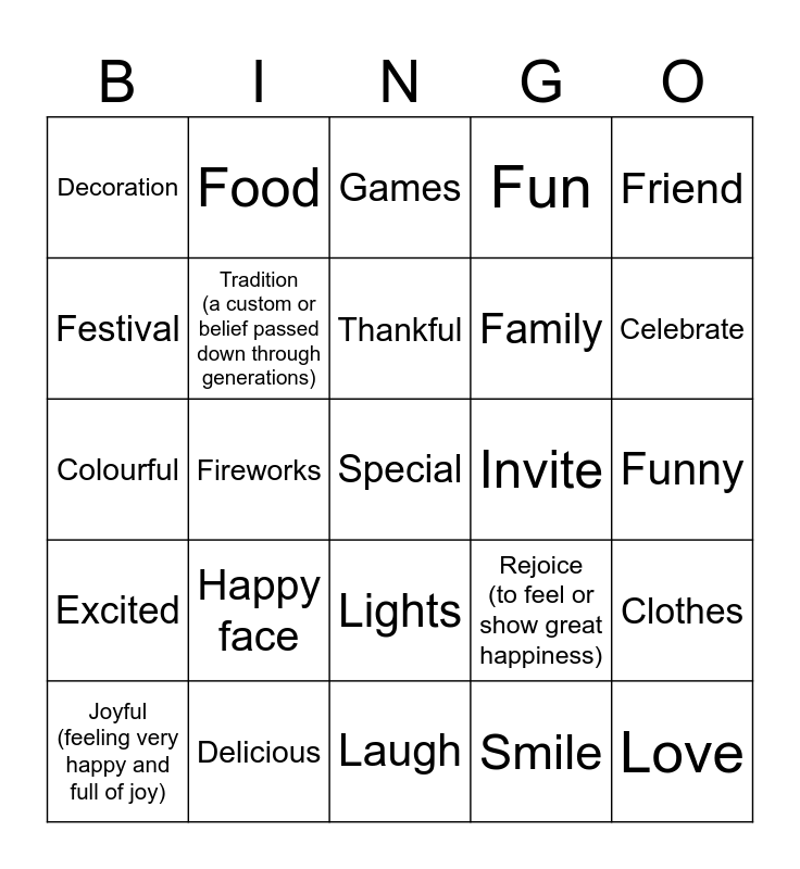 This bingo card has a free space and 24 words: Happy face, Delicious, Thankful, Joyful (feeling very happy and full of joy), Friend, Decoration, Festival, Food, Invite, Lights, Family, Colourful, Rejoice (to feel or show great happiness), Clothes, Tradition (a custom or belief passed down through generations), Smile, Funny, Games, Celebrate, Fireworks, Love, Excited, Fun and Laugh.