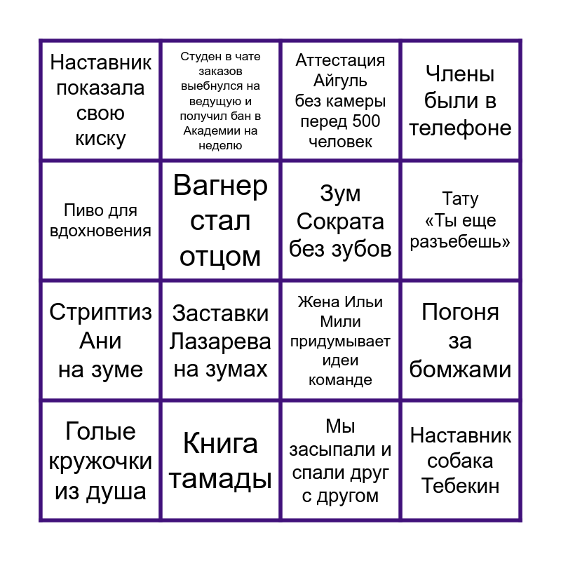 This bingo card has 46 words: Трансфер игрока из команды Фреш и его исчезновение, Голые кружочки из душа, Записали свою песню, Бухали на зуме команды, Звезда Love radio вещал из постели, Талипов сделал предложение во время обучения, Студен в чате заказов выебнулся на ведущую и получил бан в Академии на неделю, Назвал Сократа на зуме Лохом, Вагнер стал отцом, Студент уснул на зуме, Зум Сократа без зубов, Члены были в телефоне, Таня видела все груди команды Фреш, Гонки вибраторов, Таня побывала в роли ночной бабочки, Секс посох, Тату «Ты еще разъебешь», Книга тамады, Порнуха на зуме, Пиво для вдохновения, Погоня за бомжами, Анекдоты Чулкова, Наставник показала свою киску, Стриптиз Ани на зуме, Кальянофил Рубанов, Заставки Лазарева на зумах, Модный приговор Пежемского, Рич в ночи в зуме, Чернецов провел гендерпати для Соболева, Наставник собака Тебекин, Фристайлы Наиля, Сократ орал на техников перед онлайн шоу, Идея Федькина на онлайн шоу, Студент в трусах на зуме, Васильев в спижженном халате из Шератона, В душе танцевал чувашские песни на общем зуме, Мы засыпали и спали друг с другом, Получили пизды за зум с Саловым, Индивидуальное обучение Влада Иванова, Хорошко пропал после первой защиты на 3 недели, Саид построил дом, Аттестация Айгуль без камеры перед 500 человек, Жена Ильи Мили придумывает идеи команде, Куликов устал от зумов и пошел смотреть фильмы на проекторе, Индиго пошел разбираться с соседом и на защите был с ожогом глаз and Слитые нюдсы ASTI в чате команды.