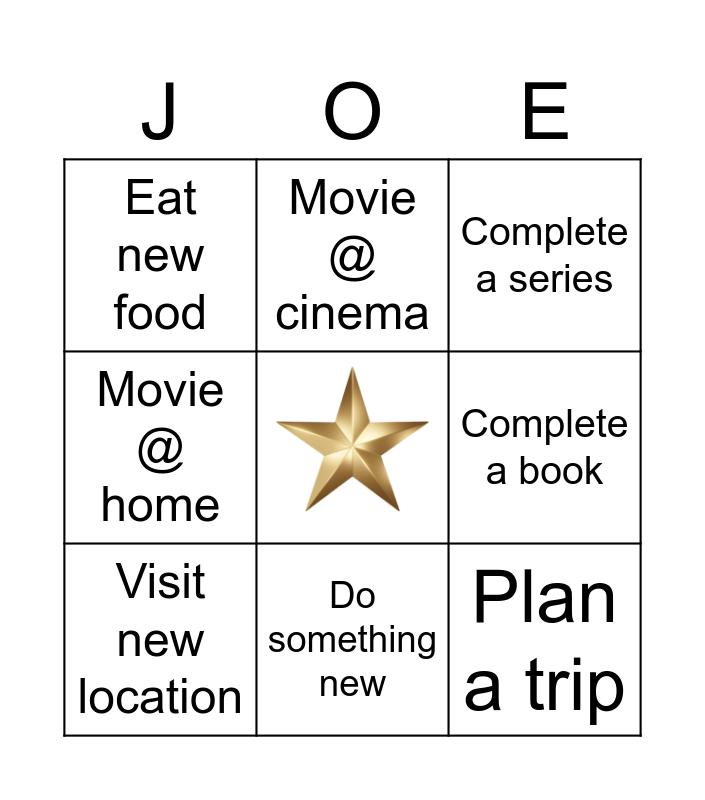 This bingo card has a free space and 8 words: Movie @ home, Movie @ cinema, Complete a book, Visit new location, Complete a series, Eat new food, Do something new and Plan a trip.