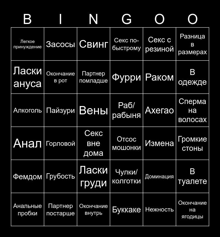 This bingo card has 36 words: Чулки/колготки, Ласки груди, Буккаке, Ласки ануса, Анал, Раб/рабыня, Окончание в рот, Окончание внутрь, Секс с резиной, Доминация, В одежде, Секс по-быстрому, В туалете, Пайзури, Фурри, Легкое принуждение, Фемдом, Ахегао, Алкоголь, Свинг, Вены, Горловой, Отсос мошонки, Секс вне дома, Измена, Засосы, Раком, Партнер постарше, Партнер помладше, Разница в размерах, Окончание на ягодицы, Анальные пробки, Громкие стоны, Сперма на волосах, Грубость and Нежность.