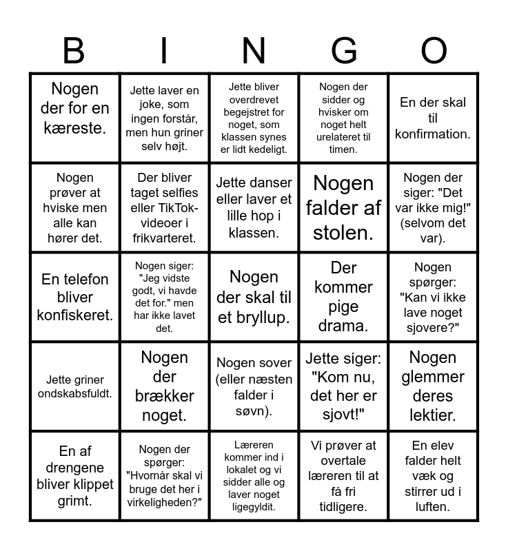 This bingo card has 25 words: Nogen der brækker noget., Læreren kommer ind i lokalet og vi sidder alle og laver noget ligegyldit., Jette danser eller laver et lille hop i klassen., En af drengene bliver klippet grimt., En der skal til konfirmation., Nogen der for en kæreste., Nogen prøver at hviske men alle kan hører det., Jette laver en joke, som ingen forstår, men hun griner selv højt., Der kommer pige drama., Nogen sover (eller næsten falder i søvn)., Nogen falder af stolen., En telefon bliver konfiskeret., Jette siger: "Kom nu, det her er sjovt!", Nogen glemmer deres lektier., Der bliver taget selfies eller TikTok-videoer i frikvarteret., En elev falder helt væk og stirrer ud i luften., Nogen spørger: "Kan vi ikke lave noget sjovere?", Jette bliver overdrevet begejstret for noget, som klassen synes er lidt kedeligt., Nogen der siger: "Det var ikke mig!" (selvom det var)., Nogen siger: "Jeg vidste godt, vi havde det for." men har ikke lavet det., Nogen der skal til et bryllup., Nogen der spørger: "Hvornår skal vi bruge det her i virkeligheden?", Jette griner ondskabsfuldt., Nogen der sidder og hvisker om noget helt urelateret til timen. and Vi prøver at overtale læreren til at få fri tidligere..