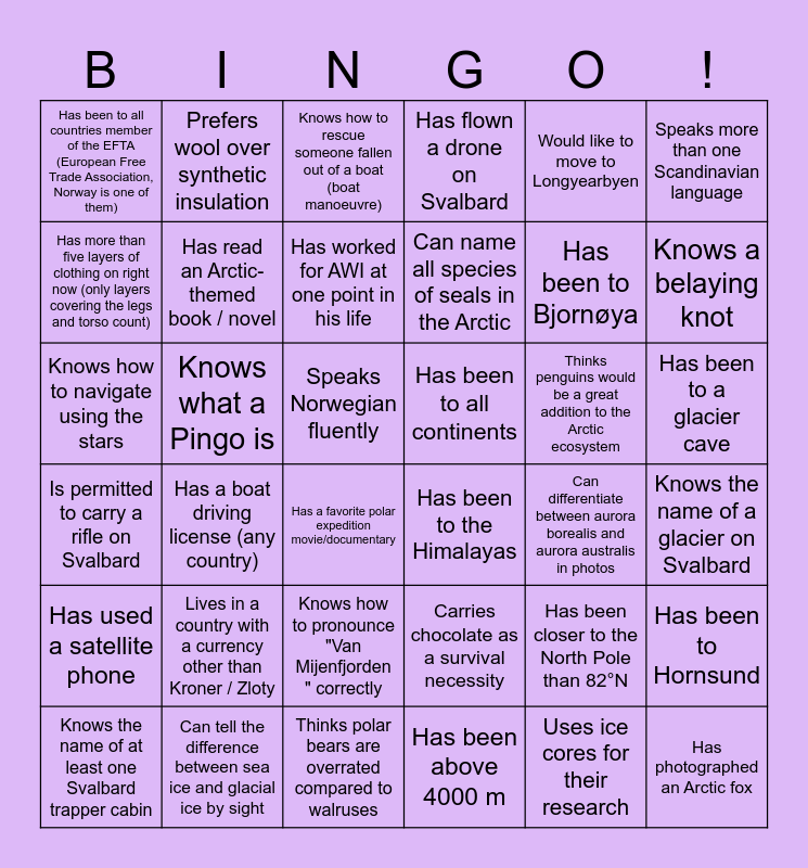 This bingo card has 69 words: Knows where the city of Tiksi is, Speaks Norwegian fluently, Practices skitouring (Randonnée), Has been above 4000 m, Has been to the Himalayas, Uses thermal infrared (TIR) data for their research, Has flown a drone on Svalbard, Has been to Ny-Alesund, Would like to move to Longyearbyen, Has been on an icebreaker, Has a boat driving license (any country), Has a kayak certification (våttkort), Has been to all countries member of the EFTA (European Free Trade Association, Norway is one of them), Knows how to rescue someone fallen out of a boat (boat manoeuvre), Knows at least one knot to tie a boat to the shore, Knows a belaying knot, Has been to a glacier cave, Has worked for AWI at one point in his life, Knows the mean permafrost temperature at the Bayelva station, Has been to all continents, Knows what a Pingo is, Is permitted to carry a rifle on Svalbard, Can name all species of seals in the Arctic, Knows how to pronounce "Van Mijenfjorden " correctly, Has been to Hornsund, Owns a physical map of (a part of) Svalbard, Prefers snowshoes over skis, Has slept in an ice cave, Knows the name of a glacier on Svalbard, Has been to a hot spring in the Arctic, Prefers wool over synthetic insulation, Has seen the southern lights (aurora australis), Has tasted seal or whale meat, Has completed a scientific expedition on foot or skis, Thinks polar bears are overrated compared to walruses, Can tell the difference between sea ice and glacial ice by sight, Has studied sea ice or permafrost, Has been closer to the North Pole than 82°N, Speaks more than one Scandinavian language, Has used a satellite phone, Thinks penguins would be a great addition to the Arctic ecosystem, Knows how to navigate using the stars, Carries chocolate as a survival necessity, Believes the Arctic tern is the coolest Arctic bird, Has completed a Polar Plunge (swimming in freezing waters), Has a favorite polar expedition movie/documentary, Uses ice cores for their research, Can explain why polar bears don't live in the Antarctic, Collects rocks or ice samples as souvenirs, Has more than five layers of clothing on right now (only layers covering the legs and torso count), Has read an Arctic-themed book / novel, Thinks Svalbard reindeer are cuter than regular reindeer, Knows the name of at least one Svalbard trapper cabin, Can differentiate between aurora borealis and aurora australis in photos, Has worked on a research vessel in the Arctic, Sees themselves overwintering at a research station, Wants to become a professor, Has tried all beer from the Svalbard Bryggeri, Lives in a country with a currency other than Kroner / Zloty, Has been to Bjornøya, Has been to Jan Mayen, Can imitate a seal sound, Touched a polar bear, Has photographed an Arctic fox, Owns / has owned a husky dog, Can start a fire without a lighter/matches, Went to a SIOS training course, Created a NetCDF file of their data and uploaded it to the SIOS portal and Has driven a snowmobile faster than 100 km/hr.