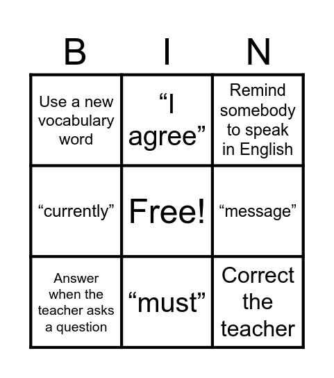 This bingo card has a free space and 30 words: Speak to somebody you don’t normally speak to, Ask the teacher a question, Help somebody, Speak only English during the whole class, Use a new vocabulary word, Remind somebody to speak in English, Answer when the teacher asks a question, Ask a classmate to spell a word, Ask your classmate a question, Use a phrasal verb, Use 3 different connectors, Use present continuous, Use present perfect, Use past simple, Use the comparative/superlative, Use a conditional sentence, Talk about the future, Use “will” to make an offer/promise/prediction, Use “Shall I/we...?” to make a suggestion/offer, Correct the teacher, “comfortable”, “fruit”, “I agree”, “since”, “message”, “currently”, “culture”, “tired”, “must” and “can”.