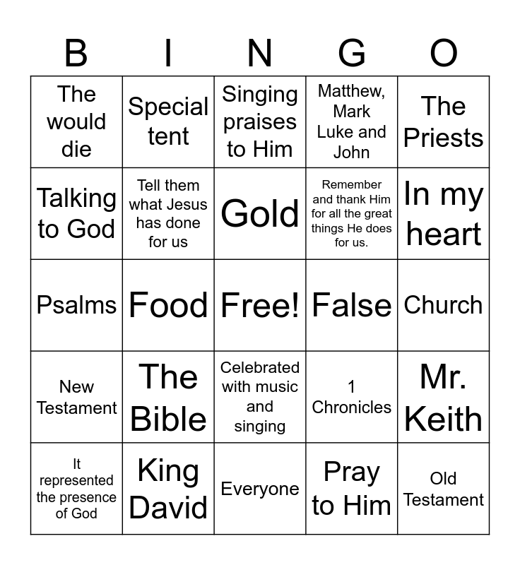 This bingo card has a free space and 24 words: The Bible, King David, Gold, It represented the presence of God, The Priests, The would die, Talking to God, Special tent, False, Celebrated with music and singing, Remember and thank Him for all the great things He does for us., Psalms, 1 Chronicles, Mr. Keith, Tell them what Jesus has done for us, Pray to Him, Church, Singing praises to Him, In my heart, Food, Old Testament, New Testament, Matthew, Mark Luke and John and Everyone.