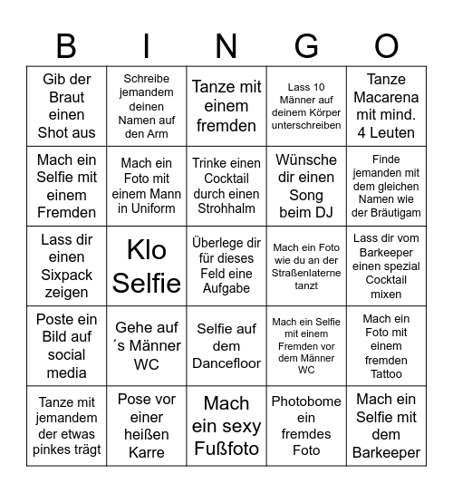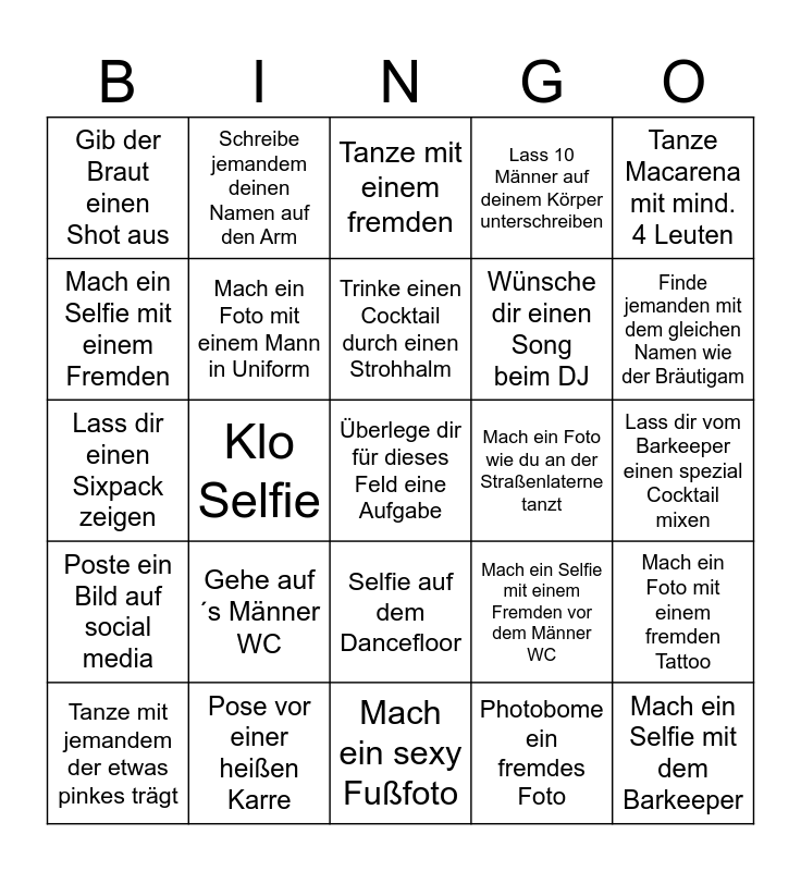This bingo card has a free space and 24 words: Gehe auf´s Männer WC, Pose vor einer heißen Karre, Trinke einen Cocktail durch einen Strohhalm, Tanze mit jemandem der etwas pinkes trägt, Tanze Macarena mit mind. 4 Leuten, Gib der Braut einen Shot aus, Mach ein Selfie mit einem Fremden, Schreibe jemandem deinen Namen auf den Arm, Mach ein Foto wie du an der Straßenlaterne tanzt, Selfie auf dem Dancefloor, Wünsche dir einen Song beim DJ, Lass dir einen Sixpack zeigen, Mach ein Selfie mit einem Fremden vor dem Männer WC, Mach ein Foto mit einem fremden Tattoo, Mach ein Foto mit einem Mann in Uniform, Photobome ein fremdes Foto, Lass dir vom Barkeeper einen spezial Cocktail mixen, Tanze mit einem fremden, Finde jemanden mit dem gleichen Namen wie der Bräutigam, Klo Selfie, Mach ein Selfie mit dem Barkeeper, Poste ein Bild auf social media, Lass 10 Männer auf deinem Körper unterschreiben and Mach ein sexy Fußfoto.