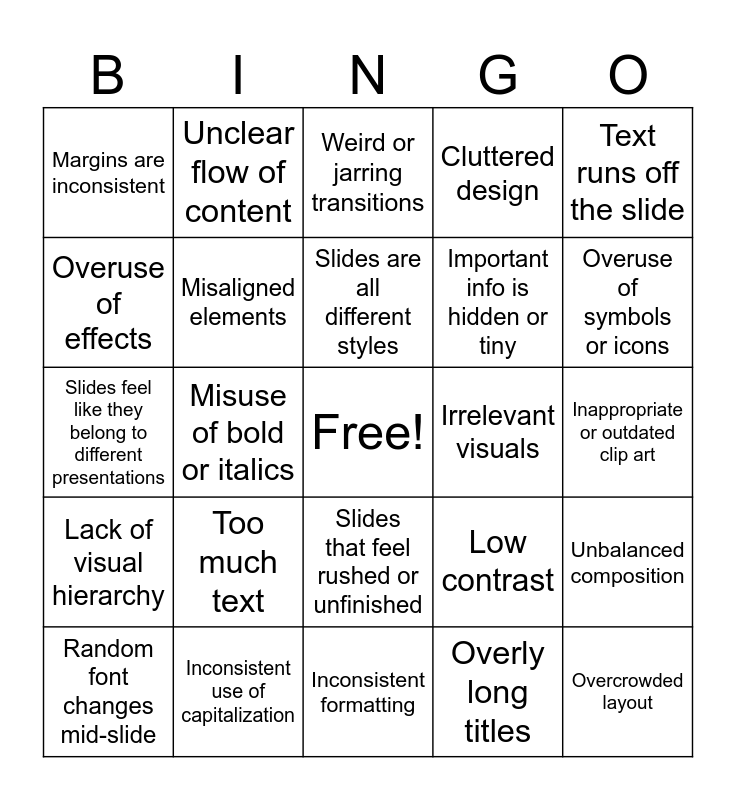 This bingo card has a free space and 49 words: Hard-to-read slides, Overcrowded layout, Distracting visuals, Inconsistent formatting, Too much text, Bad color choices, Unclear flow of content, Poor image quality, Overuse of effects, Fonts are hard to read, Misaligned elements, Cluttered design, Unbalanced composition, Low contrast, Overly simplistic design, No clear theme, Slides are all different styles, Irrelevant visuals, Pointless animations, Text runs off the slide, Misuse of bold or italics, Overly long titles, Margins are inconsistent, Important info is hidden or tiny, Backgrounds overpower text, Overuse of symbols or icons, Random font changes mid-slide, Too many different shapes, Slides that feel rushed or unfinished, Lack of visual hierarchy, Text placed directly over busy images, No slide numbers, Poor alignment of text and visuals, Everything crammed into one corner, Inconsistent use of capitalization, Design doesn’t match the topic, Excessive use of gradients, Overly bright or neon colors, Inappropriate or outdated clip art, Overwhelming amount of charts, Icons that don’t match the theme, No clear call to action, Repetitive content across slides, Over-reliance on one color, Slides feel like they belong to different presentations, Weird or jarring transitions, Title and content too close together, No breathing room (white space) and Misleading or poorly labeled visuals.