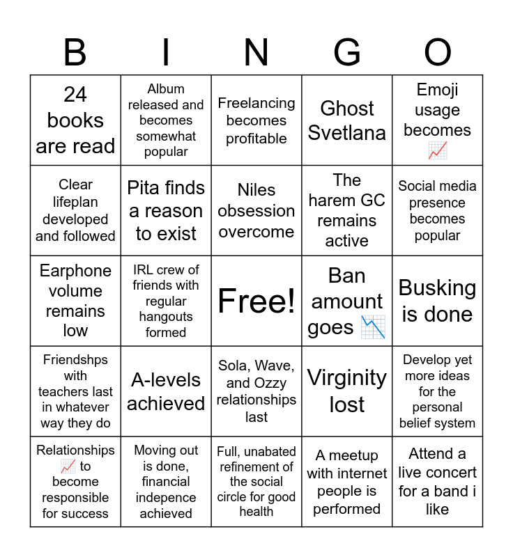 This bingo card has a free space and 24 words: A-levels achieved, Moving out is done, financial indepence achieved, Niles obsession overcome, Relationships 📈 to become responsible for success, Emoji usage becomes 📈, 24 books are read, Clear lifeplan developed and followed, Album released and becomes somewhat popular, Ban amount goes 📉, Sola, Wave, and Ozzy relationships last, The harem GC remains active, Earphone volume remains low, Virginity lost, Develop yet more ideas for the personal belief system, Pita finds a reason to exist, A meetup with internet people is performed, Busking is done, Freelancing becomes profitable, Social media presence becomes popular, IRL crew of friends with regular hangouts formed, Attend a live concert for a band i like, Friendshps with teachers last in whatever way they do, Ghost Svetlana and Full, unabated refinement of the social circle for good health.