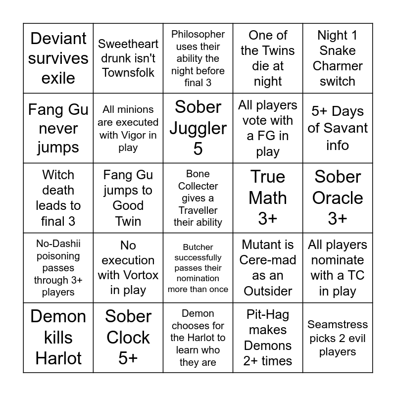 This bingo card has a free space and 24 words: No execution with Vortox in play, Sober Clock 5+, Sober Juggler 5, Demon kills Harlot, Night 1 Snake Charmer switch, Deviant survives exile, Fang Gu never jumps, Sweetheart drunk isn't Townsfolk, True Math 3+, Butcher successfully passes their nomination more than once, All players vote with a FG in play, Witch death leads to final 3, Mutant is Cere-mad as an Outsider, All players nominate with a TC in play, All minions are executed with Vigor in play, Pit-Hag makes Demons 2+ times, Sober Oracle 3+, Philosopher uses their ability the night before final 3, 5+ Days of Savant info, Fang Gu jumps to Good Twin, Seamstress picks 2 evil players, No-Dashii poisoning passes through 3+ players, One of the Twins die at night and Demon chooses for the Harlot to learn who they are.