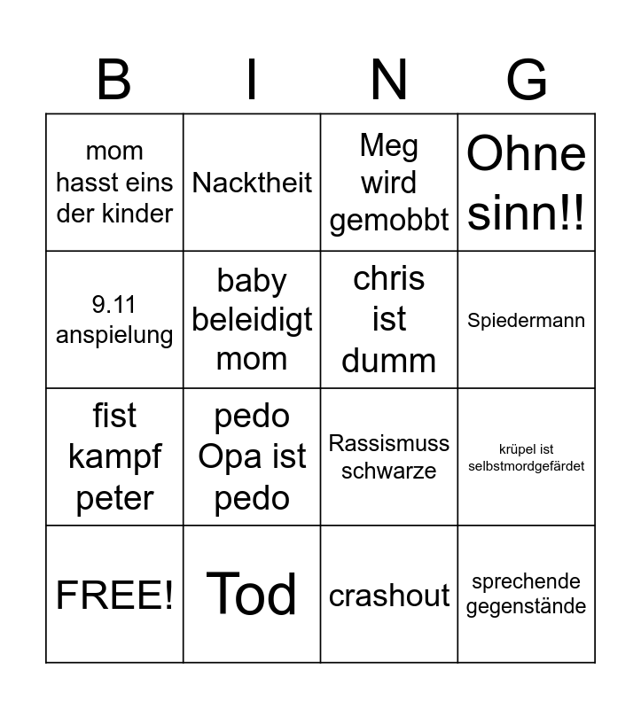 This bingo card has 16 words: Tod, krüpel ist selbstmordgefärdet, Meg wird gemobbt, mom hasst eins der kinder, fist kampf peter, Nacktheit, Rassismuss schwarze, crashout, 9.11 anspielung, baby beleidigt mom, FREE!, Ohne sinn!!, pedo Opa ist pedo, Spiedermann, chris ist dumm and sprechende gegenstände.