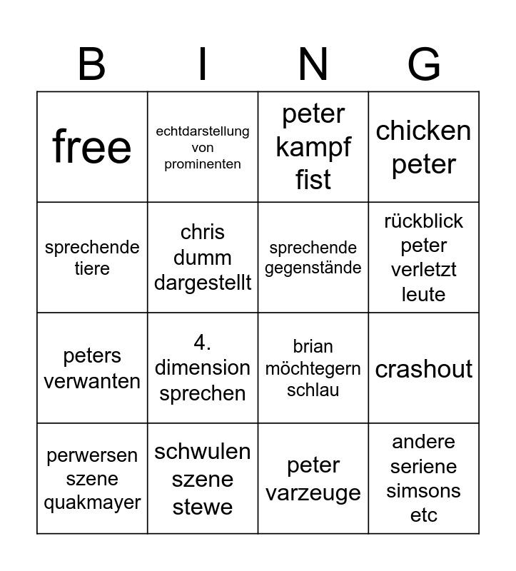 This bingo card has 16 words: perwersen szene quakmayer, schwulen szene stewe, peter kampf fist, chicken peter, sprechende tiere, echtdarstellung von prominenten, brian möchtegern schlau, crashout, free, chris dumm dargestellt, peter varzeuge, rückblick peter verletzt leute, peters verwanten, 4. dimension sprechen, sprechende gegenstände and andere seriene simsons etc.