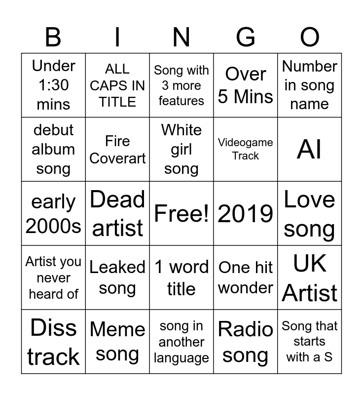 This bingo card has a free space and 24 words: Leaked song, Meme song, White girl song, Diss track, Number in song name, Under 1:30 mins, debut album song, ALL CAPS IN TITLE, 2019, 1 word title, Videogame Track, early 2000s, One hit wonder, UK Artist, Fire Coverart, Radio song, Love song, Song with 3 more features, AI, Dead artist, Song that starts with a S, Artist you never heard of, Over 5 Mins and song in another language.