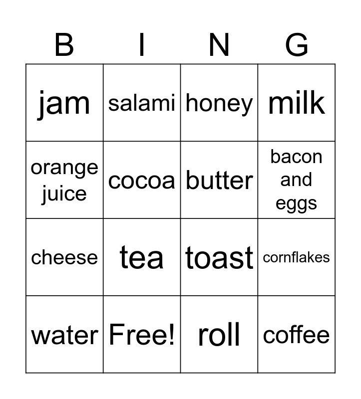 This bingo card has 16 words: Free!, cornflakes, honey, jam, cheese, salami, toast, roll, orange juice, cocoa, water, milk, tea, bacon and eggs, butter and coffee.