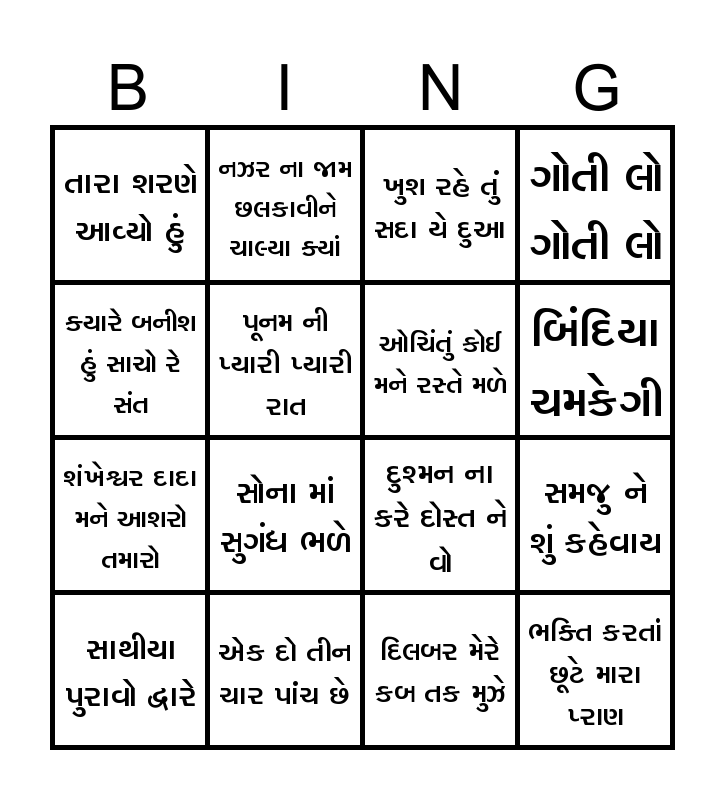This bingo card has 51 words: છેલા જીઃ રે મારે હાટુ પાટણ થી, સાથીયા પુરાવો દ્વારે, નાગર નંદ જી ના લાલ, તારી આંખ નો અફીણી, હે તને જાતાં જોઇ પનઘટની, નયન ને બંધ રાખી ને, નઝર ના જામ છલકાવીને ચાલ્યા ક્યાં, પંખીડા ને આ પીંજરું, પૂનમ ની પ્યારી પ્યારી રાત, દિવસો જુદાઈના જાય છે, ઓચિંતું કોઈ મને રસ્તે મળે, ગોતી લો ગોતી લો, માંગુ છું એટલું હું, તું મને ભગવાન એક વરદાન, કર્મો કરેલા મૂજને નડે છે, ખુલ્લાં મૂક્યા છે મેં તો, બિંદિયા ચમકેગી, એક દો તીન ચાર પાંચ છે, પાપી ને તું પ્યાર કરી લે, ક્યારે બનીશ હું સાચો રે સંત, સમજુ ને શું કહેવાય, પ્યાર કિયા તો ડરના ક્યા, તારા શરણે આવ્યો હું, શંખેશ્વર દાદા મને આશરો તમારો, મૈં ચલી મૈં ચલી દેખો, ફૂલો કા તારોં કા, સોના માં સુગંધ ભળે, આશ ભરીને આવ્યો સ્વામી, સુહાના સફર ઔર યે મૌસમ, ખુશ રહે તું સદા યે દુઆ, પરદેશીઓ સે ના અખિયાં મિલાના, અંતર ના અંતરીક્ષ માં મને, ચિંતામણી મારી ચિંતા ચૂર, મેરે મેહબૂબ તુઝે મેરી, યે શામ મસ્તાની મદહોશ, ચંદા હૈ તું મેરા સૂરજ હૈ તું, આજ મૌસમ બડા બેઈમાન હૈ, મૈં શાયર તો નહીં, જેની કીકી કાળી છે, તેરે ચેહરે મેં વો જાદુ હૈ, દિલબર મેરે કબ તક મુઝે, ભક્તિ કરતાં છૂટે મારા પ્રાણ, ઊંગ્લી પકડ કે તુને ચલના, દિલ કે ઝરોખે મૈં તુજકો, મેરે ઝોપડી કે ભાગ આજ ખુલ, જાઇયે આપ કહાં જાયેંગે, દુશ્મન ના કરે દોસ્ત ને વો, હર ઘડી બદલ રહી હૈ રૂપ, તાક્તે રેહતે તુજકો સાંજ સવેરે, આવ્યો પ્રભુ તારે દ્વાર and છોડ ચાડ કે અપને સલીમ કી ગલી.