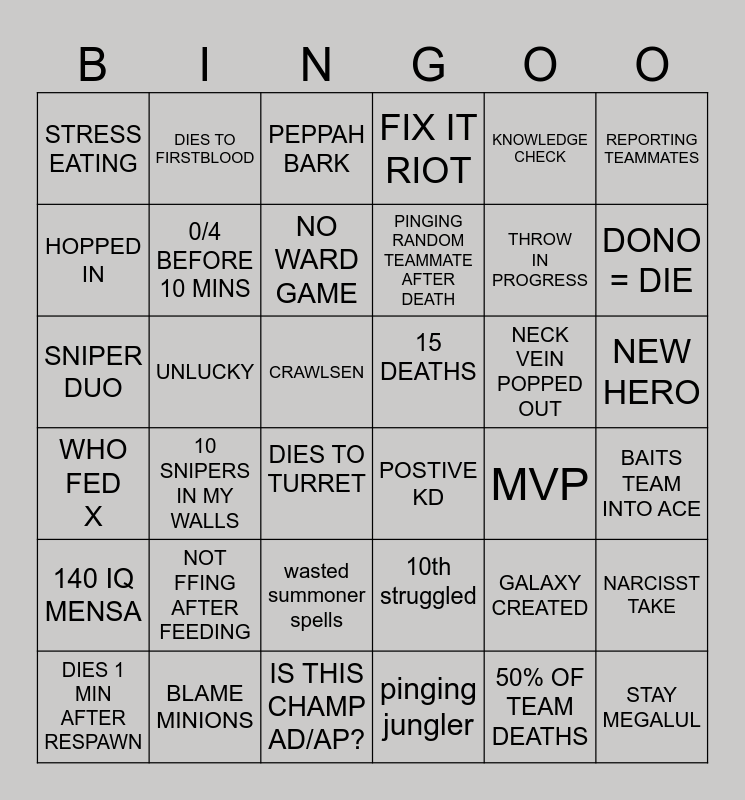 This bingo card has 36 words: 10th struggled, wasted summoner spells, pinging jungler, HOPPED IN, WHO FED X, 15 DEATHS, 0/4 BEFORE 10 MINS, IS THIS CHAMP AD/AP?, KNOWLEDGE CHECK, GALAXY CREATED, DONO = DIE, FIX IT RIOT, NARCISST TAKE, UNLUCKY, PINGING RANDOM TEAMMATE AFTER DEATH, STRESS EATING, 140 IQ MENSA, NECK VEIN POPPED OUT, SNIPER DUO, PEPPAH BARK, CRAWLSEN, 10 SNIPERS IN MY WALLS, POSTIVE KD, DIES TO TURRET, MVP, DIES TO FIRSTBLOOD, THROW IN PROGRESS, BLAME MINIONS, NO WARD GAME, REPORTING TEAMMATES, STAY MEGALUL, DIES 1 MIN AFTER RESPAWN, BAITS TEAM INTO ACE, NEW HERO, NOT FFING AFTER FEEDING and 50% OF TEAM DEATHS.