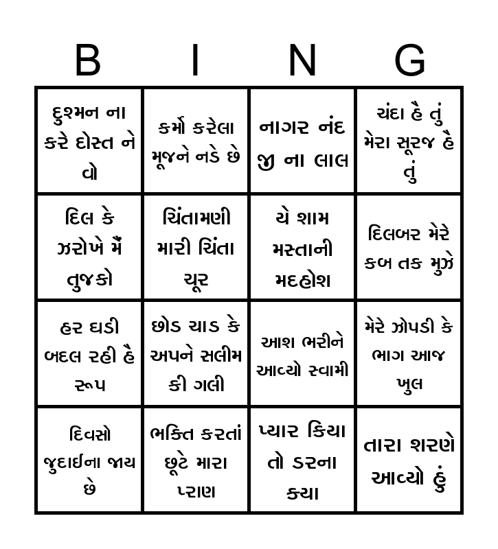 This bingo card has 51 words: પૂનમ ની પ્યારી પ્યારી રાત, દિવસો જુદાઈના જાય છે, ઓચિંતું કોઈ મને રસ્તે મળે, ગોતી લો ગોતી લો, માંગુ છું એટલું હું, તું મને ભગવાન એક વરદાન, કર્મો કરેલા મૂજને નડે છે, ખુલ્લાં મૂક્યા છે મેં તો, ચિંતામણી મારી ચિંતા ચૂર, મેરે મેહબૂબ તુઝે મેરી, યે શામ મસ્તાની મદહોશ, ચંદા હૈ તું મેરા સૂરજ હૈ તું, આજ મૌસમ બડા બેઈમાન હૈ, મૈં શાયર તો નહીં, જેની કીકી કાળી છે, તેરે ચેહરે મેં વો જાદુ હૈ, દિલબર મેરે કબ તક મુઝે, ભક્તિ કરતાં છૂટે મારા પ્રાણ, ઊંગ્લી પકડ કે તુને ચલના, દિલ કે ઝરોખે મૈં તુજકો, મેરે ઝોપડી કે ભાગ આજ ખુલ, જાઇયે આપ કહાં જાયેંગે, દુશ્મન ના કરે દોસ્ત ને વો, હર ઘડી બદલ રહી હૈ રૂપ, તાક્તે રેહતે તુજકો સાંજ સવેરે, આવ્યો પ્રભુ તારે દ્વાર, છોડ ચાડ કે અપને સલીમ કી ગલી, છેલા જીઃ રે મારે હાટુ પાટણ થી, સાથીયા પુરાવો દ્વારે, નાગર નંદ જી ના લાલ, તારી આંખ નો અફીણી, હે તને જાતાં જોઇ પનઘટની, નયન ને બંધ રાખી ને, નઝર ના જામ છલકાવીને ચાલ્યા ક્યાં, પંખીડા ને આ પીંજરું, બિંદિયા ચમકેગી, એક દો તીન ચાર પાંચ છે, પાપી ને તું પ્યાર કરી લે, ક્યારે બનીશ હું સાચો રે સંત, સમજુ ને શું કહેવાય, પ્યાર કિયા તો ડરના ક્યા, તારા શરણે આવ્યો હું, શંખેશ્વર દાદા મને આશરો તમારો, મૈં ચલી મૈં ચલી દેખો, ફૂલો કા તારોં કા, સોના માં સુગંધ ભળે, આશ ભરીને આવ્યો સ્વામી, સુહાના સફર ઔર યે મૌસમ, ખુશ રહે તું સદા યે દુઆ, પરદેશીઓ સે ના અખિયાં મિલાના and અંતર ના અંતરીક્ષ માં મને.