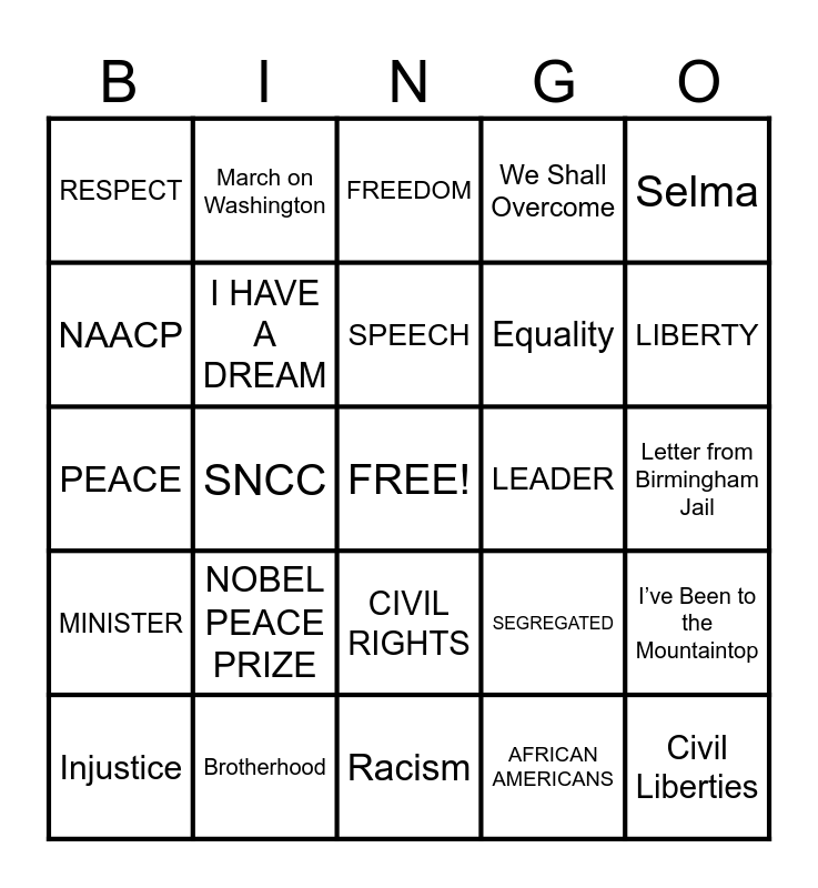This bingo card has a free space and 34 words: EQUAL RIGHTS, AFRICAN AMERICANS, Coretta Scott King, GEORGIA, MINISTER, I HAVE A DREAM, Selma, Injustice, March on Washington, MARTIN LUTHER KING Jr., SPEECH, FREEDOM, ALABAMA, BOYCOTT, LEADER, LIBERTY, Brotherhood, PEACE, NOBEL PEACE PRIZE, SEGREGATED, CIVIL RIGHTS, JUSTICE, RESPECT, Letter from Birmingham Jail, Racism, Civil Liberties, We Shall Overcome, Love, Equality, NAACP, Sit-ins, SNCC, I’ve Been to the Mountaintop and Activist.