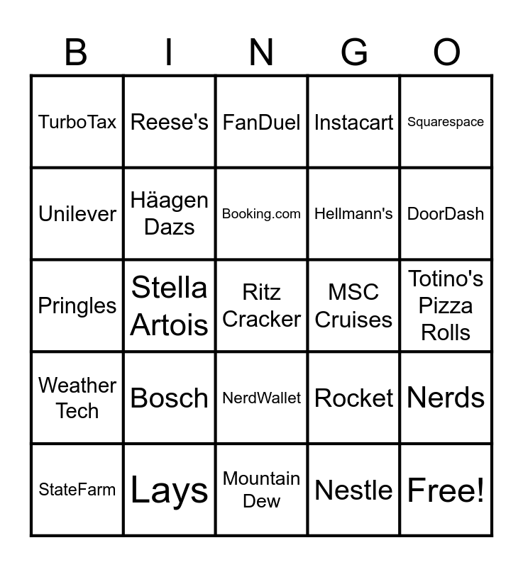This bingo card has 33 words: Free!, Budweiser, Stella Artois, Coors, Weather Tech, Häagen Dazs, Squarespace, StateFarm, Reese's, Duracell, Booking.com, FanDuel, GoDaddy, Jeep, MSC Cruises, DoorDash, Lays, Pringles, Bosch, Rocket, NerdWallet, Taco Bell, TurboTax, Totino's Pizza Rolls, Mountain Dew, Ritz Cracker, Instacart, Hellmann's, Unilever, Nerds, Dorito, Nestle and Skecher.