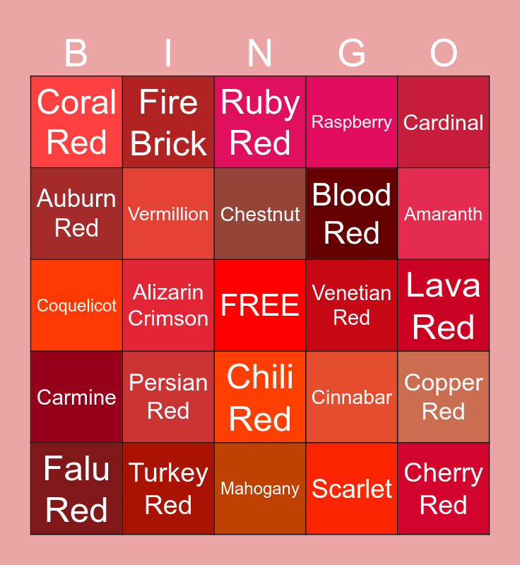 This bingo card has a free space and 34 words: Crimson, Scarlet, Burgundy, Maroon, Carmine, Vermillion, Cardinal, Falu Red, Fire Brick, Candy Apple Red, Chestnut, Ruby Red, Coral, Fire Engine Red, Venetian Red, Amaranth, Turkey Red, Coquelicot, Persian Red, Cinnabar, Chili Red, Rusty Red, Coral Red, Lava Red, Mahogany, Cherry Red, Raspberry, Red Violet, Blood Red, Auburn Red, Deep Red, Alizarin Crimson, Copper Red and Wine.
