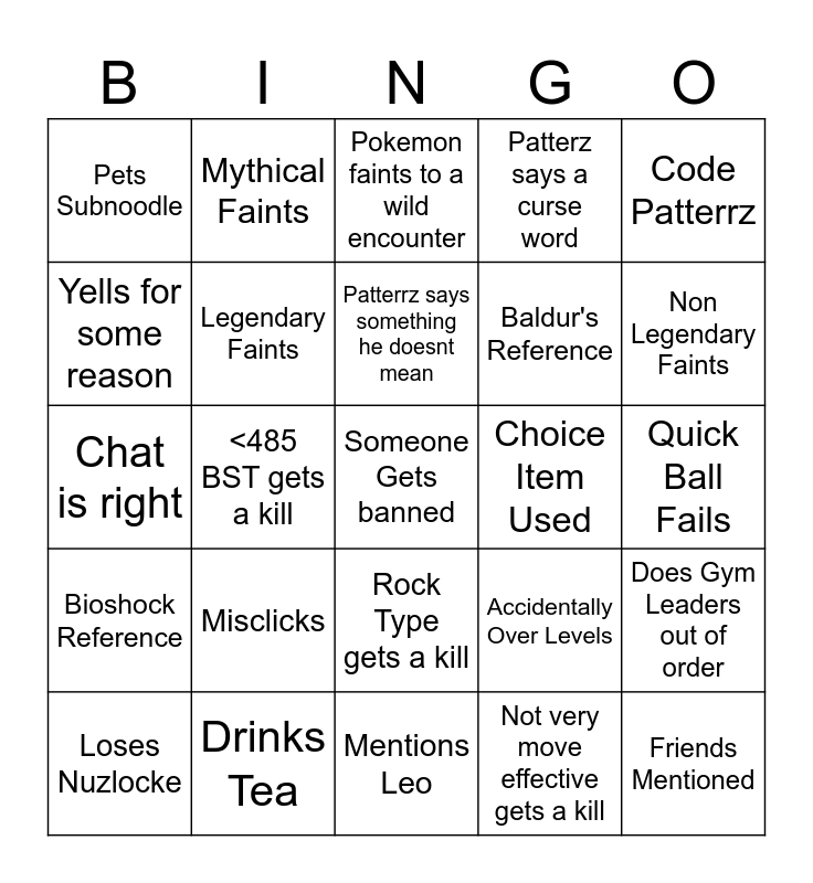This bingo card has 25 words: Bioshock Reference, Drinks Tea, Someone Gets banned, Not very move effective gets a kill, Code Patterrz, Pets Subnoodle, Mythical Faints, Pokemon faints to a wild encounter, Choice Item Used, Does Gym Leaders out of order, Yells for some reason, Legendary Faints, Mentions Leo, Accidentally Over Levels, Non Legendary Faints, Loses Nuzlocke, <485 BST gets a kill, Patterrz says something he doesnt mean, Baldur's Reference, Quick Ball Fails, Chat is right, Misclicks, Rock Type gets a kill, Patterz says a curse word and Friends Mentioned.