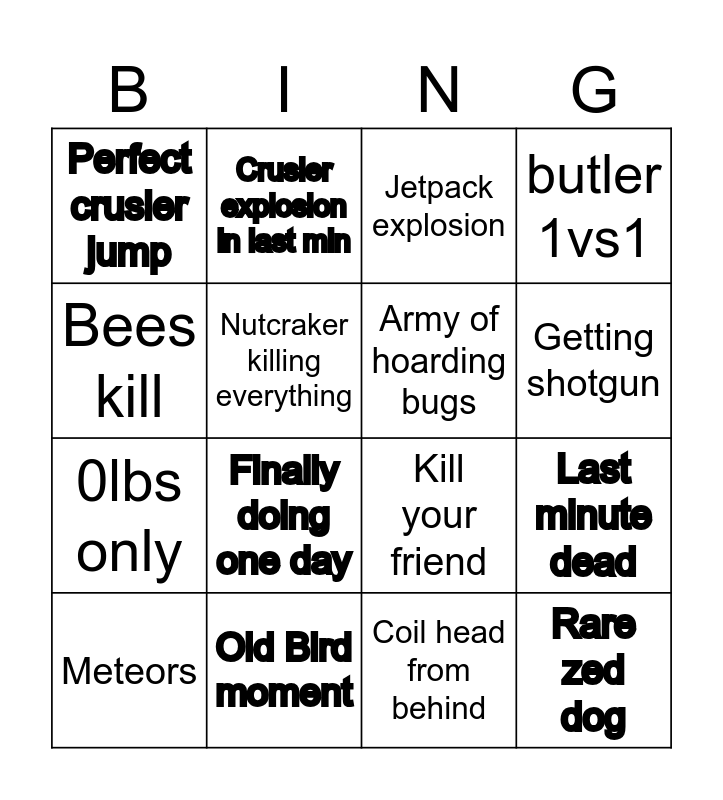 This bingo card has 16 words: Old Bird moment, Last minute dead, Jetpack explosion, Perfect crusier jump, 0lbs only, Crusier explosion in last min, Kill your friend, Coil head from behind, Bees kill, Nutcraker killing everything, Meteors, butler 1vs1, Finaliy doing one day, Getting shotgun, Army of hoarding bugs and Rare zed dog.