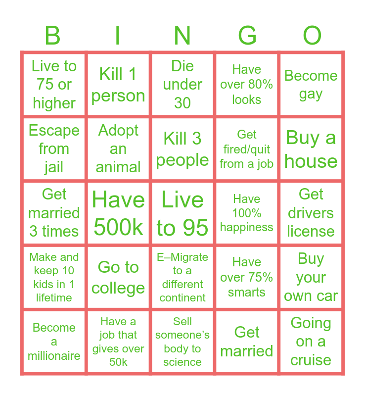 This bingo card has a free space and 24 words: Become a millionaire, Go to college, Kill 3 people, Get married, Become gay, Live to 75 or higher, Kill 1 person, Die under 30, Have 100% happiness, Get drivers license, Get married 3 times, Adopt an animal, Have over 75% smarts, Buy your own car, Escape from jail, Have a job that gives over 50k, Sell someone’s body to science, Have over 80% looks, Buy a house, Make and keep 10 kids in 1 lifetime, Have 500k, E–Migrate to a different continent, Get fired/quit from a job and Going on a cruise.