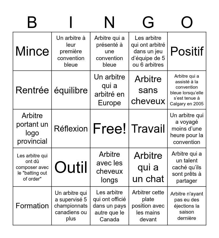 This bingo card has a free space and 24 words: Outil, Un arbitre qui a supervisé 5 championnats canadiens ou plus, Un arbitre qui a arbitré en Europe, Formation, Positif, Mince, Rentrée, Un arbitre à leur première convention bleue, Travail, Arbitre avec les cheveux longs, Arbitre sans cheveux, Arbitre portant un logo provincial, Arbitre qui a un chat, Arbitre qui a un talent caché qu’ils sont prêts à partager, équilibre, Arbitrer cette plate position avec les mains devant, Un arbitre qui a voyagé moins d’une heure pour la convention, Arbitre qui a présenté à une convention bleue, Arbitre qui a assisté à la convention bleue lorsqu’elle s’est tenue à Calgary en 2005, Réflexion, Arbitre n'ayant pas eu des éjections la saison dernière, Les arbitre qui ont dû composer avec le "batting out of order", Les arbitre qui ont arbitré dans un jeu d’équipe de 5 ou 6 arbitres and Les arbitre qui ont officié dans un pays autre que le Canada.